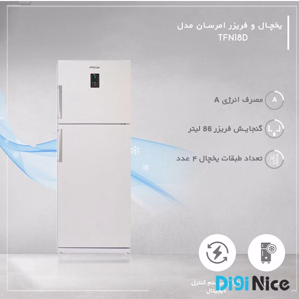 یخچال فریزر 18 فوت بدون برفک امرسان یکی از یخچال‌های ساده، به‌صرفه و کم‌مصرف از سری یخچال‌های بالاپایین شرکت امرسان Emersun است که به دلیل فضای مناسب داخل یخچال، یکی از پرطرفدارترین مدل یخچال‌ و فریزر‌های ایرانی میباشد. گنجایش کلی این محصول ۳۸۰ لیتر است که سهم یخچال ۲۷۰ لیتر و سهم فریزر ۸۶ لیتر است که فضای نسبتا کمی برای سردکردن و فریز کردن مواد غذایی محسوب می‌شود. از ویژگی‌های این یخچال می‌توان به سیستم انجماد سریع و سیستم کنترل دیجیتال، نمایشگر تاچ پنل و سیستم عیب یابی هوشمند، سیستم گردش هوای اجباری اشاره کرد. ارسال این محصول به تمامی مناطق ۲۲گانه تهران رایگان انجام میشود، برای سایر استانها، از انبار دیجی نایس در تهران تا مراکز حمل بار (باربری) بصورت رایگان ارسال میگردد و کرایه ارسال از باربری تهران تا آدرس مشتری، در زمان تحویل دریافت میگردد.